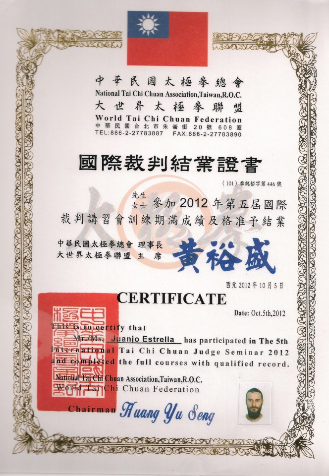Soy juez arbitro de Taijiquan, Qigong y Tuishou por diferentes federaciones. A continuación os dejo los certificados que considero más importantes.